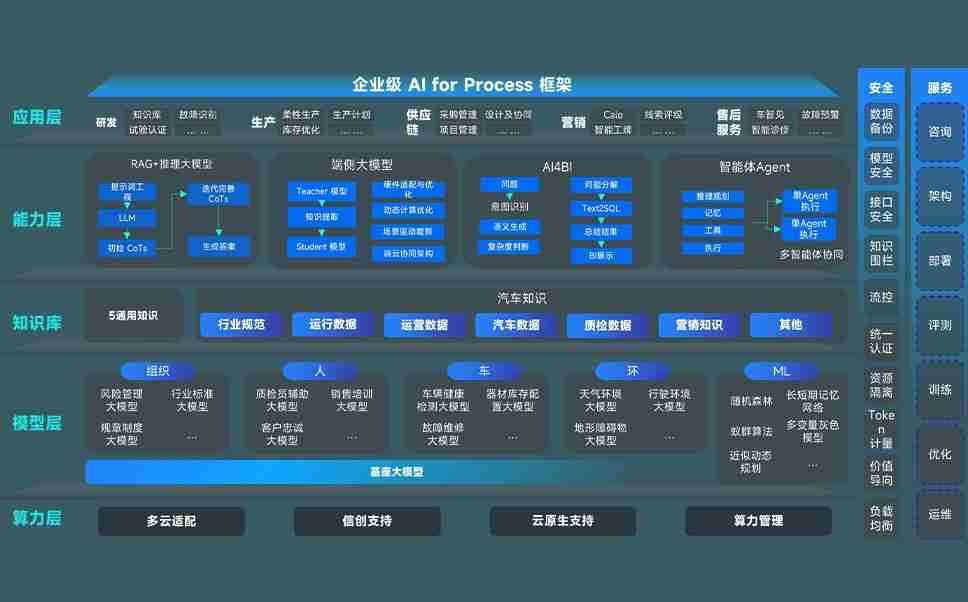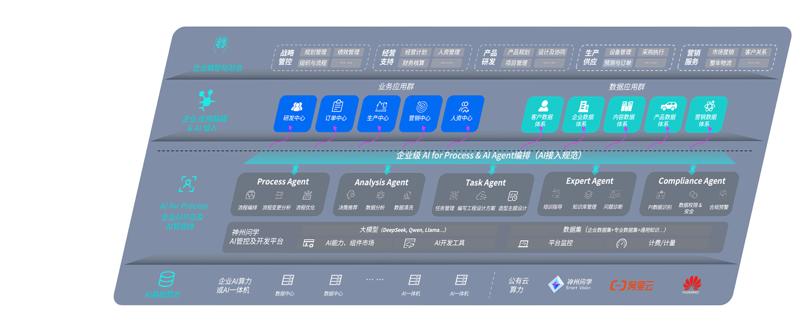 端到端的一站式AI工作空间深度融合了从企业战略规划到日常经营的全流程业务板块,,,,定向解决车企内部领域多、、、部门多、、、、链条长、、、、场景碎片化等难题,,支持车企快速构建以AI为核心的生产力写作体系,,,,实现任务执行与AI能力的无缝集成与交互