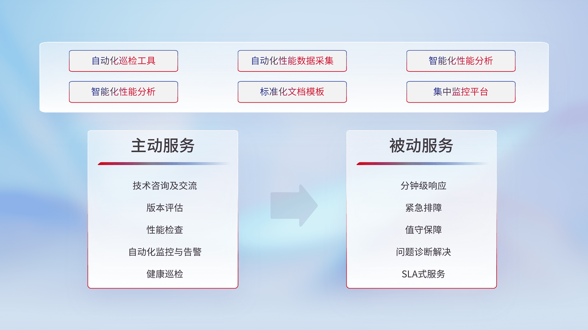 智能化工具和标准化文档,,保障服务质量,,,,提供主动服务(包含技术咨询、、版本评估、、、性能检查、、、自动化监控与告警、、健康巡检)和被动服务包含(分钟级响应、、、紧急排障、、、值守保障、、问题诊断解决、、、SLA服务)。。。。